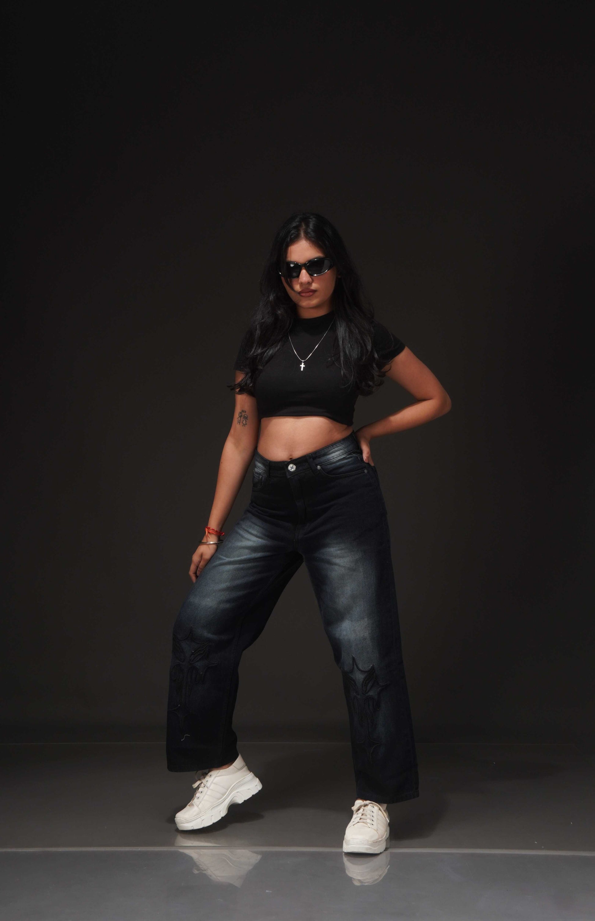 Step into the spotlight with the Shadow Bloom Denim — where high-street style meets artistic expression. These dark-wash, relaxed-fit jeans feature a unique gradient fade through the thigh, culminating in bold, intricate floral embroidery near the ankle.
